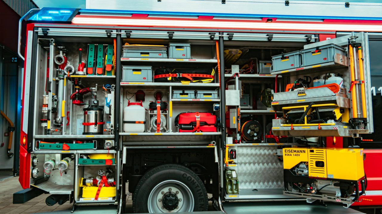 Auf dem Bild ist die Ausrüstung der linken Fahrzeugseite zu sehen. Im linken Bereich ist diverses Material für die technische Hilfeleistung, darunter Spreizer, Hebekissen und Unterlegmaterial zu sehen. Im mittleren Geräteraum befinden sich Feuerlöscher für kleinere Brandeinsätze und Material für das Öffnen von Fenstern und Türen. Der rechte Bereich beinhaltet ausschließlich Schlauchmaterial sowie einen ausklappbaren Tisch.